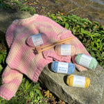 Hope Macaulayの作品はすべて、北アイルランド各地の小さな編み物チームによって手作りされています。今ならあなたも私たちの編み物チームに加わって、あなただけの特別なHope Macaulayスーパーチャンキーニットストライプセーターを編むことができます!スーパーチャンキーストライプセーターのパターンは、初心者の方にも経験豊富な方にも最適です。