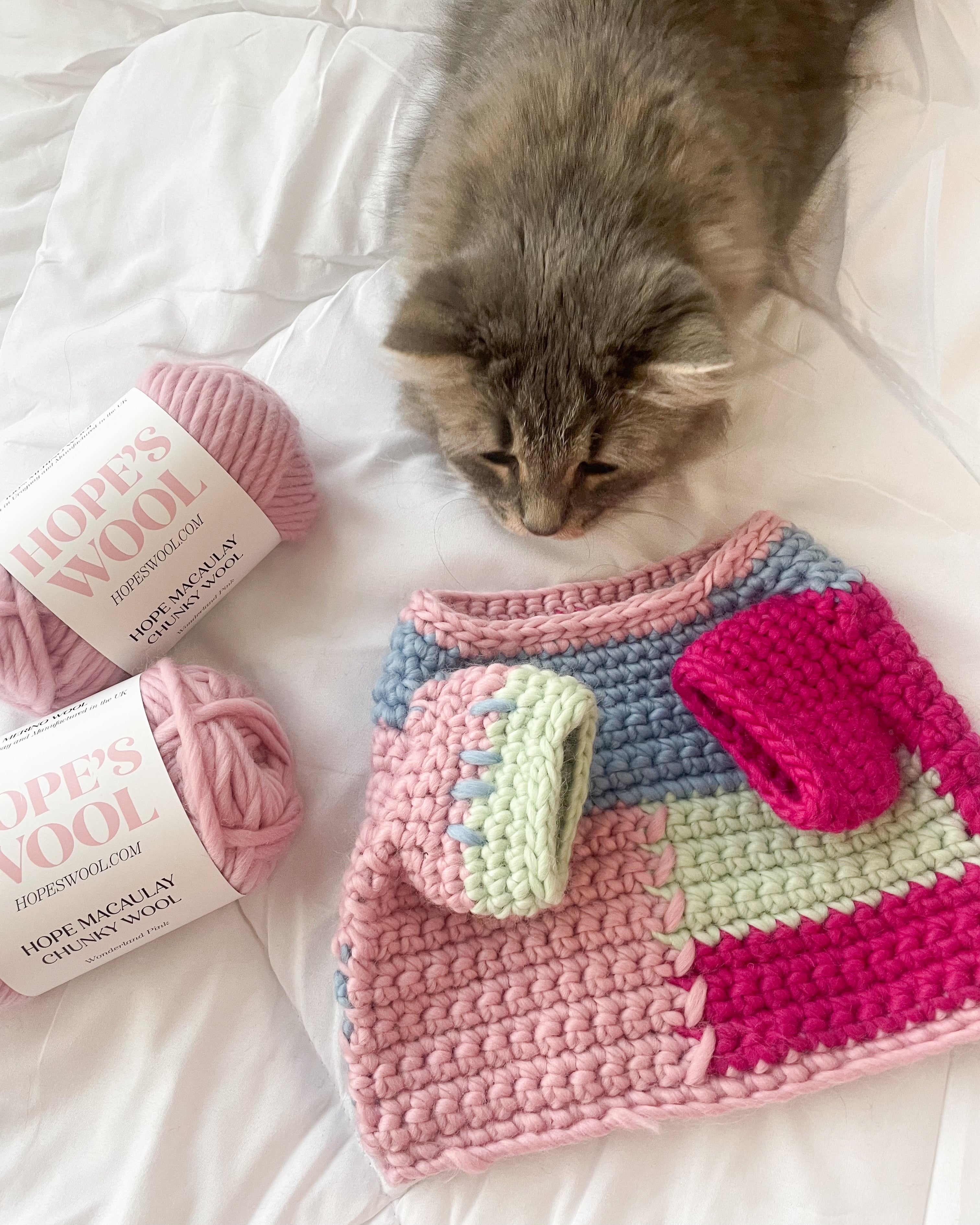 Mahum Crochets x Hope Macaulay Chunky Patchwork Pet Sweater Crochet Pattern