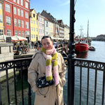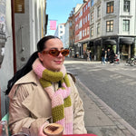 モデルはオーバー・ザ・ムーン、ワンダーランド・ピンク、チェリーのカラーのアテナ スカーフを着用しています。