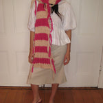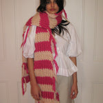 モデルは、コジークリームとローズピンクのペネロペスカーフを着用しています。
