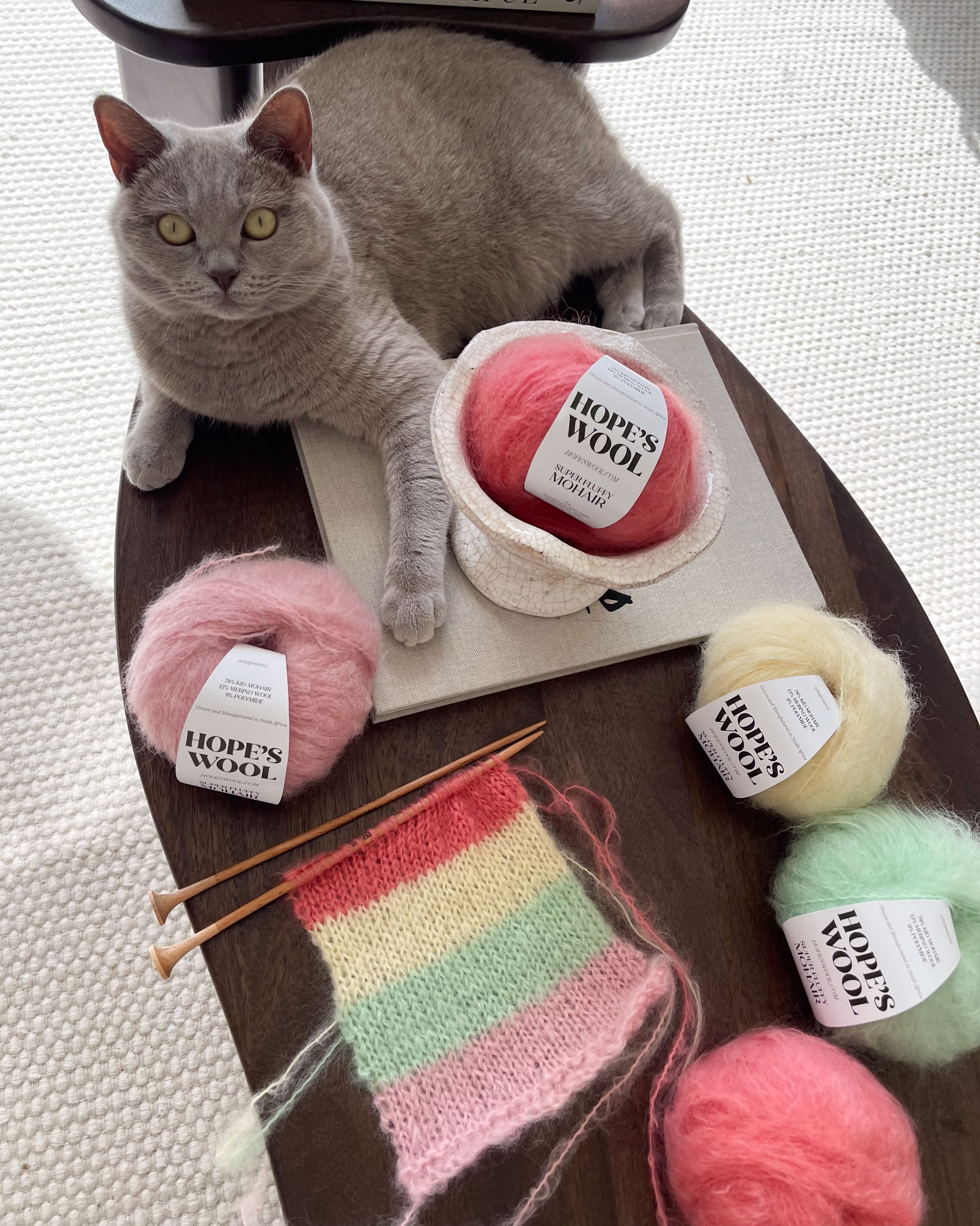 高品質のキッドモヘアを使用したこの糸は、編み物、かぎ針編み、織り物に最適です。キッドモヘア78%、メリノウール13%、ポリアミド9%で作られており、ミュールジングされていない羊の群れから責任を持って調達されています。この糸はまた、 RMS認証およびOEKO TEX 100認証を取得しています。