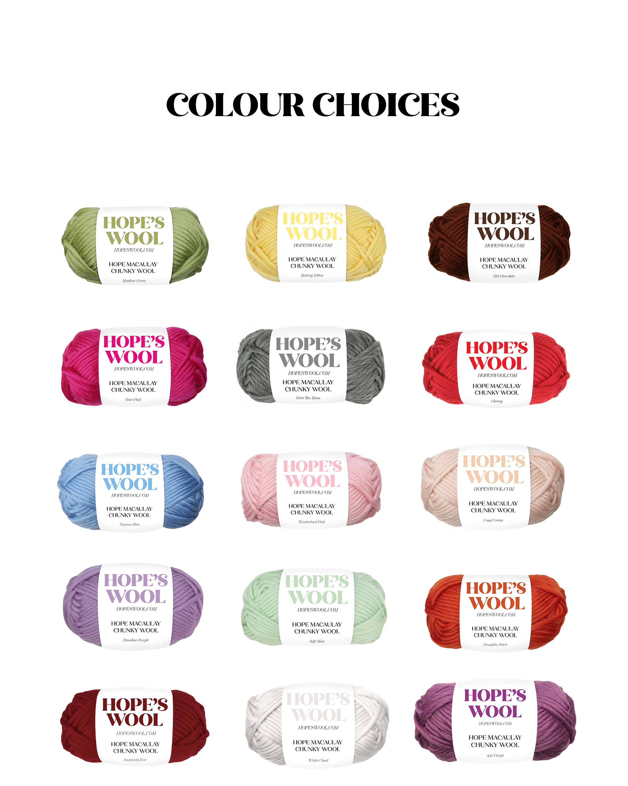 - For the Small size: 10 skeins. For the Medium size: 11 skeins. For the Large size 12 skeins. Each skein is 100g from our Chunky Wool collection in your selected colours.