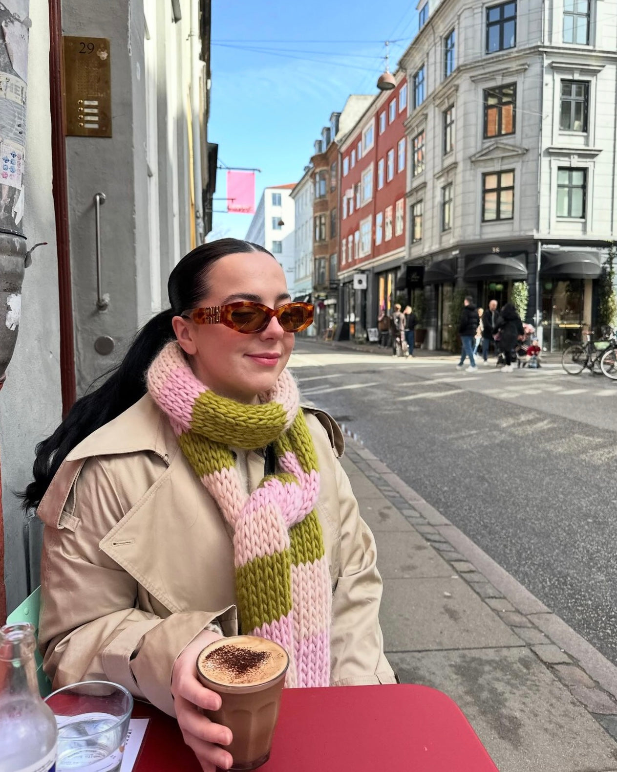 Model is wearing the Athena scarf in colours Over the Moon, Wonderland Pink and Cherry.