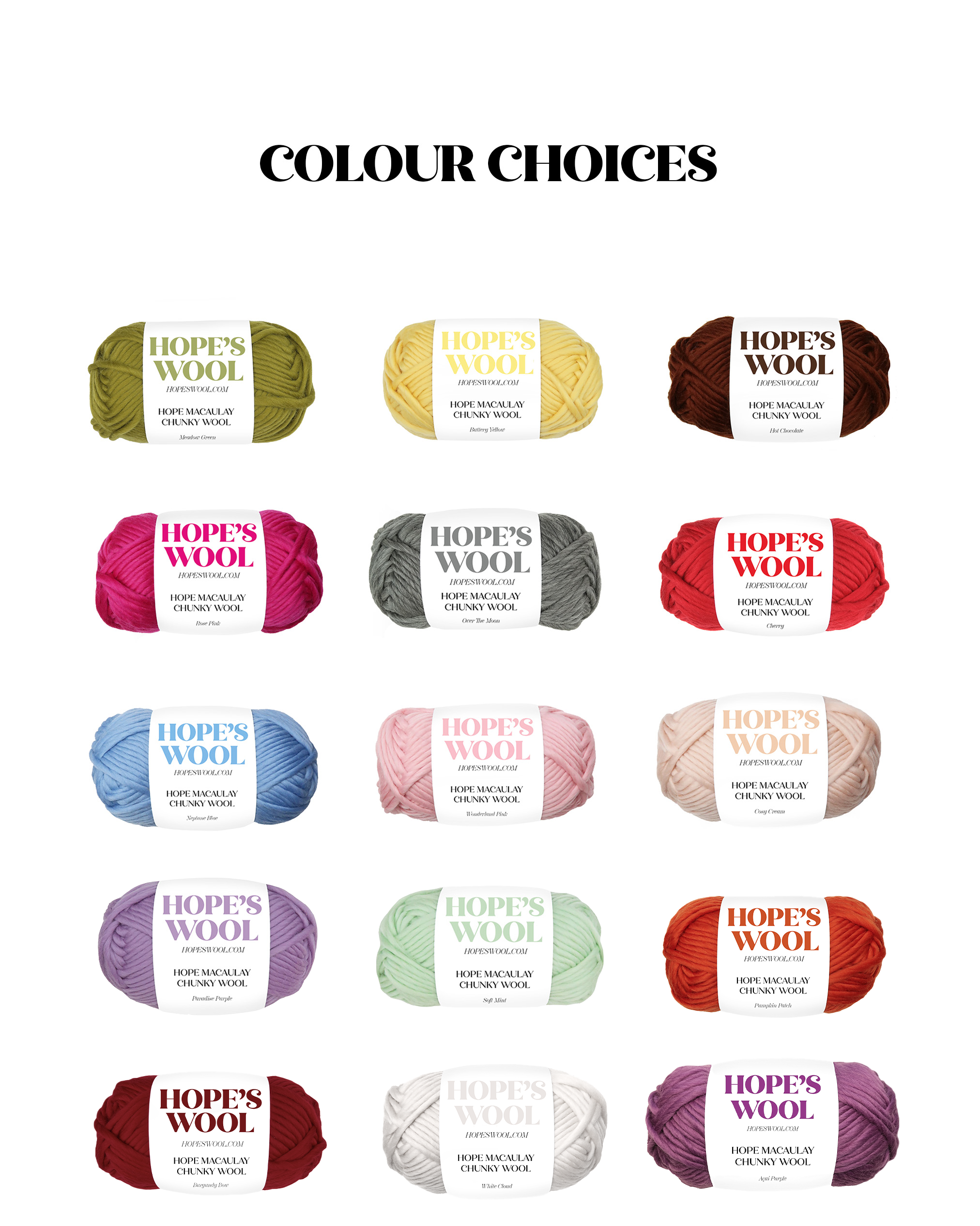 - For the Small size: 15 skeins. For the Medium size: 16 skeins. For the Large size 17 skeins. Each skein is 100g from our Chunky Wool collection in your selected colours.